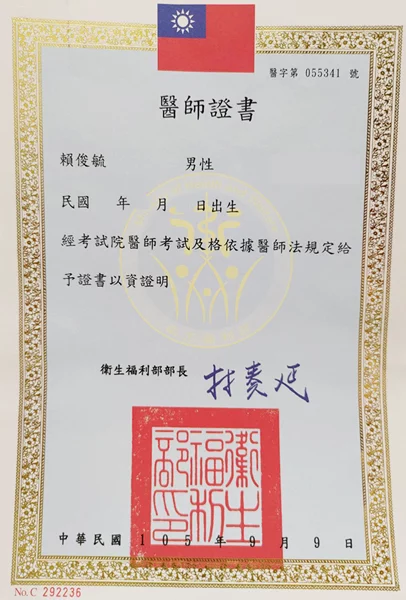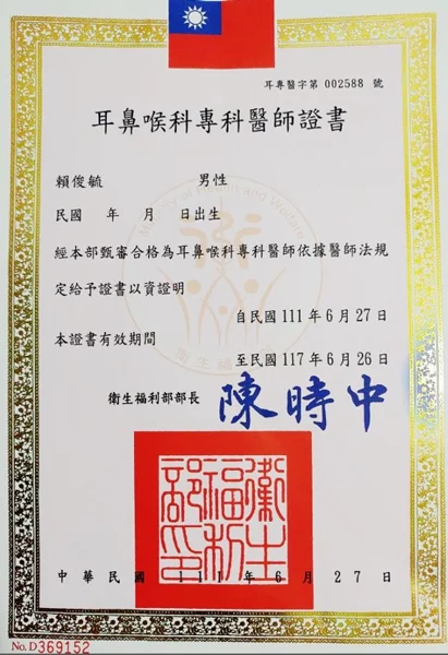 •中華民國衛生福利部 耳鼻喉科 專科醫師