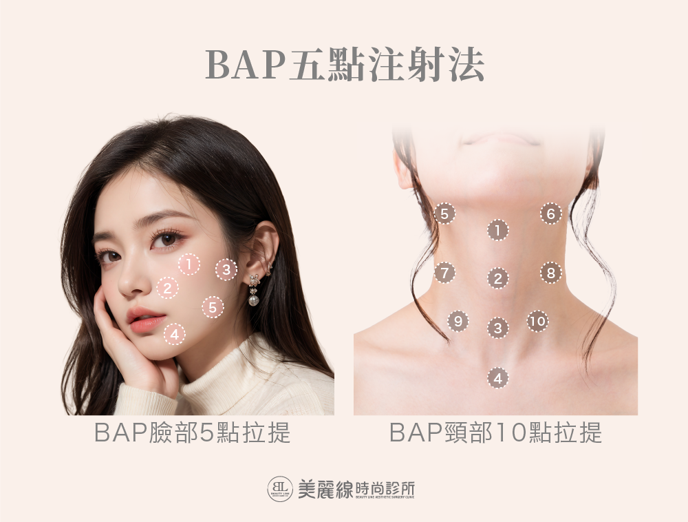 PROFHILO逆時針的「BAP五點注射法」源自面部解剖學與臨床經驗,注射點分布於顴骨下方、口周與下顎線等常見老化區域,同時避開主要血管與神經,提升治療安全性並降低瘀青風險。