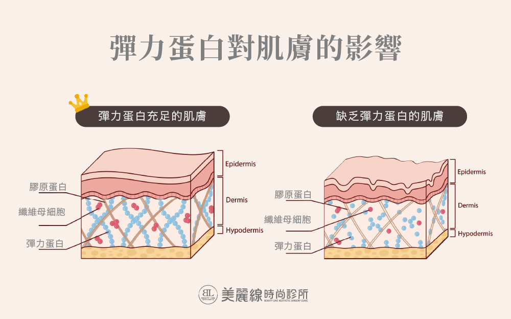 若隨著年齡增長導致彈力蛋白流失,肌膚容易失去彈性、產生皺紋,顯得鬆垮無力。