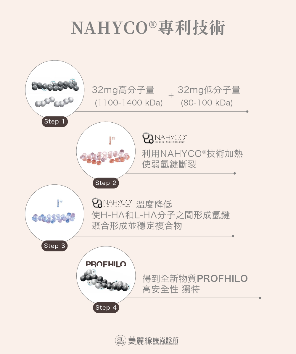 NAHYCO®專利技術是PROFHILO逆時針的重要核心,其創新之處在於結合了高安全性的線性玻尿酸與持久穩定的結構。