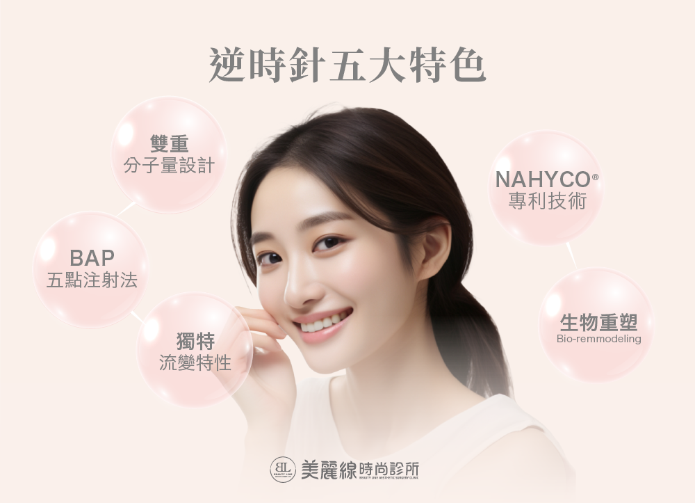 PROFHILO逆時針不同於傳統的膠原蛋白填充劑或水光針,不是單純用來填補凹陷或為肌膚補水,而是透過獨特的專利 NAHYCO® 技術,將高濃度且純淨的玻尿酸注射至真皮層與淺層脂肪細胞層,全面啟動肌膚的自我修復與再生機制,從肌底重塑肌膚、活化皮膚細胞,同時促進12倍的膠原蛋白與彈力蛋白新生,因為也被稱為新一代「彈力蛋白啟動針」。